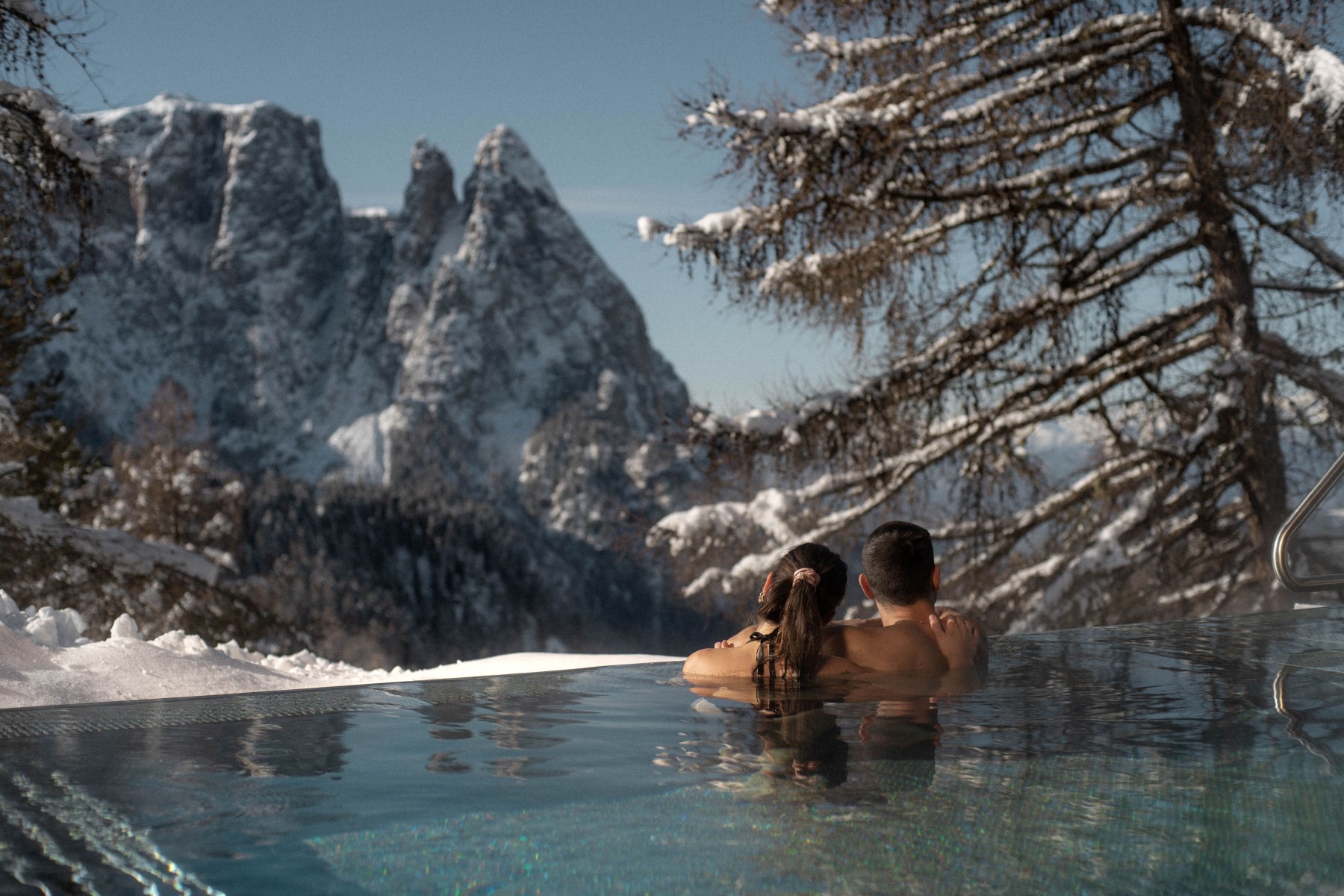 Indoor- und Outdoor Pool mit Panoramablick auf die Seiser Alm